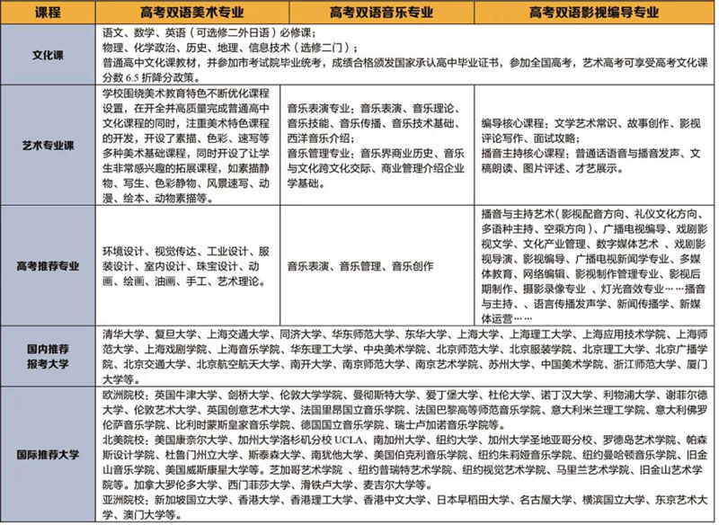 上海常青藤学校开设双轨制艺术高中课程,学生注册国家承认学历的高中学籍与英国Alevel双学籍,开设高考双语美术专业、高考双语音乐专业、高考影视编导专业,以报考国内艺术类院校为目标,兼顾申请世界知名艺术类院校,文化课任课老师大多数是原市区重点中学骨干教师把关教师,艺术专业师资是来自复旦、同济、华师、东华、上大、上师、上戏、上音等专业艺考专家团队。实行专职班主任管理模式,学校实施全员全程全面引导,注重自信、责任和理想教育。“欣赏每位学生、鼓励每次进步、助圆每个梦想”,充分挖掘学生潜能,为学生的终身幸福奠基,近几年来艺考团队培养了众多985、211以及专业艺术高校,也同时能收获到来自新加坡、香港、澳门、英国、美国、加拿大、澳大利亚、日本、意大利等众多艺术高校的Offer。